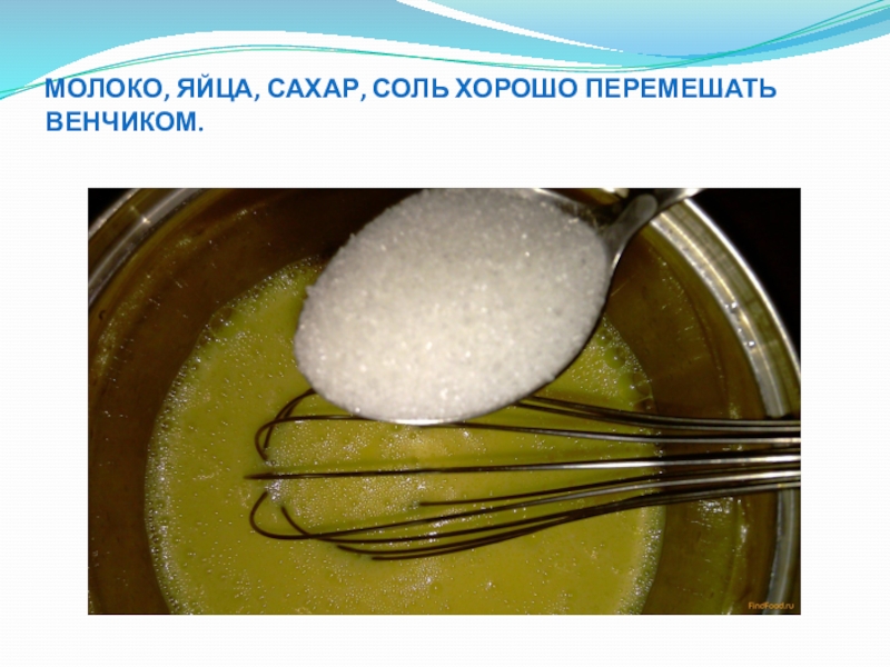 Слайд 5Молоко, яйца, сахар, соль хорошо перемешать венчиком.