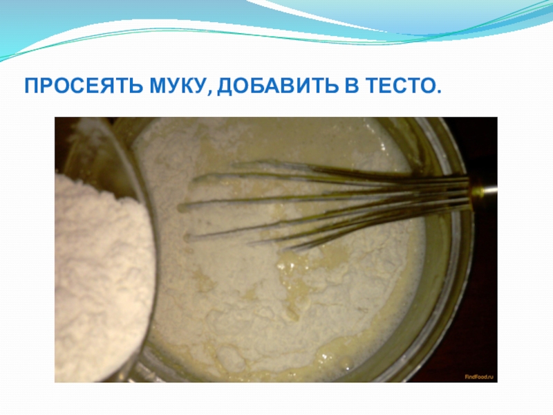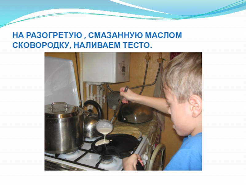 Слайд 8На разогретую , смазанную маслом сковородку, наливаем тесто.
