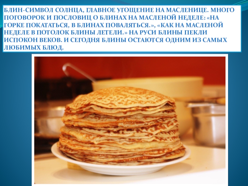 блинах на масленой неделе: «На горке покататься, в блинах поваляться.», «Как на масленой неделе в потолок блины летели.» На Руси блины пекли испокон веков. И сегодня блины остаются одним из самых любимых блюд.