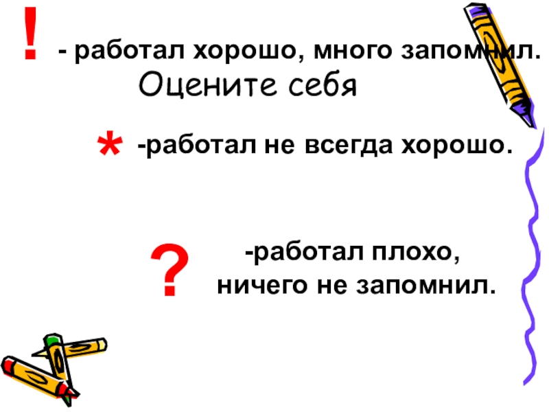 Оцените себя!- работал хорошо, много запомнил.*работал не всегда хорошо.?работал плохо, ничего не запомнил.