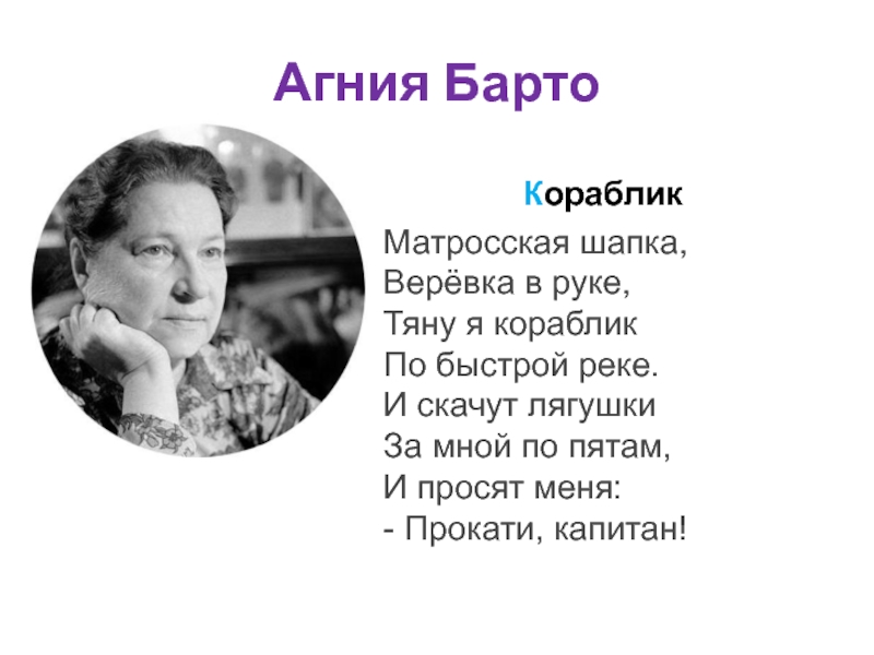 Агния БартоКорабликМатросская шапка, Верёвка в руке, Тяну я кораблик По быстрой реке. И скачут лягушки За мной