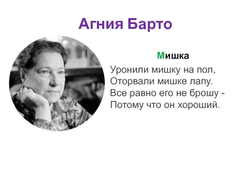 Агния БартоМишкаУронили мишку на пол, Оторвали мишке лапу. Все равно его не брошу - Потому что он