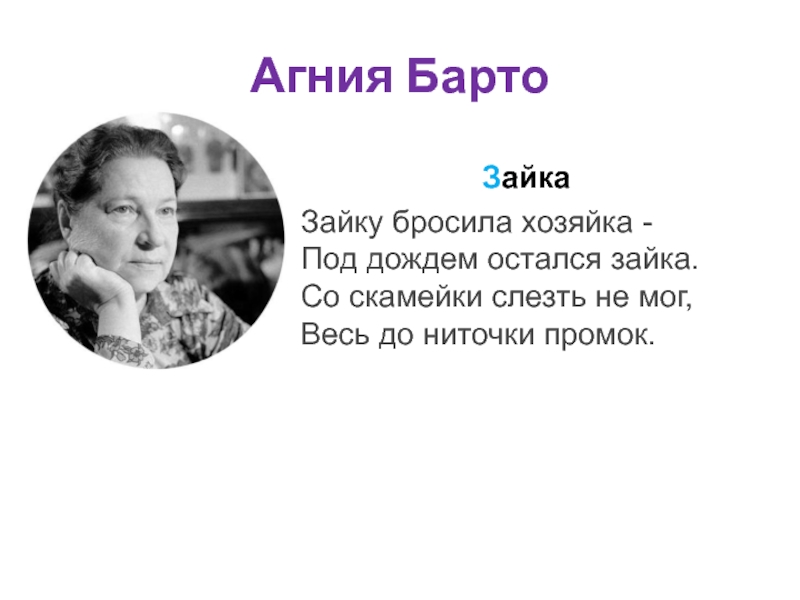Агния БартоЗайкаЗайку бросила хозяйка - Под дождем остался зайка. Со скамейки слезть не мог, Весь до ниточки