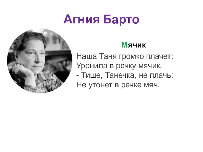 Агния БартоМячикНаша Таня громко плачет: Уронила в речку мячик. - Тише, Танечка, не плачь: Не утонет в