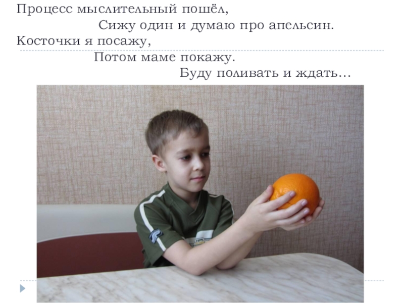 Сижу один и думаю про апельсин. Косточки я посажу, Потом маме покажу. Буду поливать и ждать…