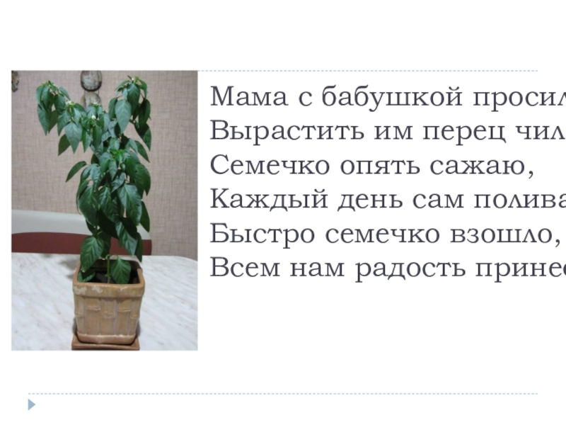Слайд 6Мама с бабушкой просили Вырастить им перец чили. Семечко опять сажаю, Каждый день сам