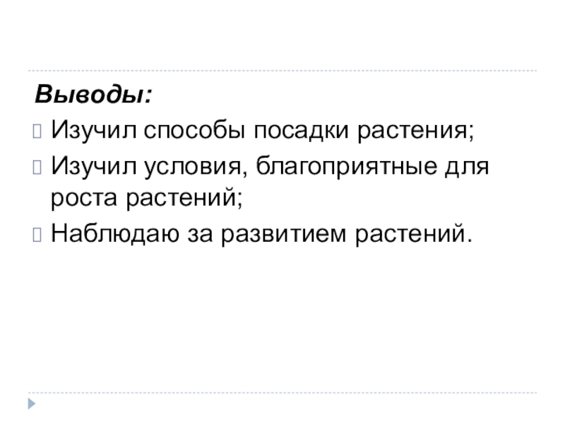 Выводы:Изучил способы посадки растения;Изучил условия, благоприятные для роста растений;Наблюдаю за развитием растений.