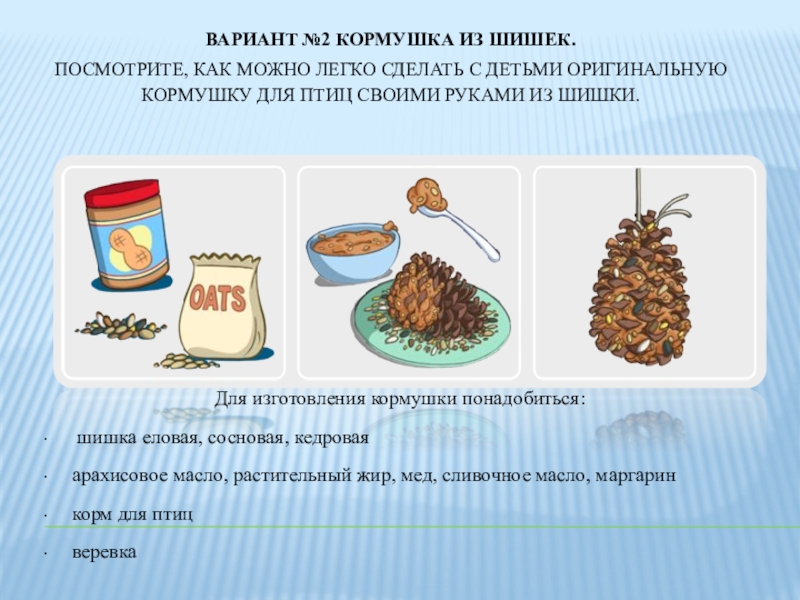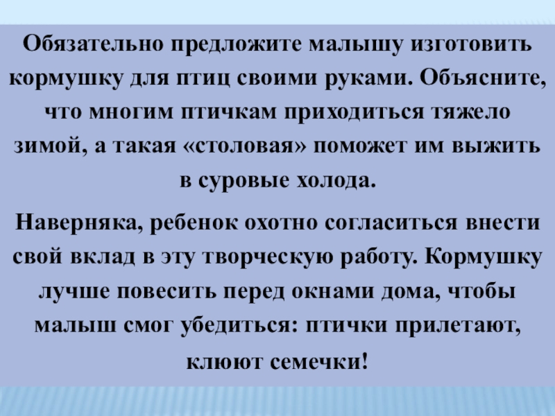 Слайд 26Обязательно предложите малышу изготовить кормушку для птиц своими руками. Объясните, что