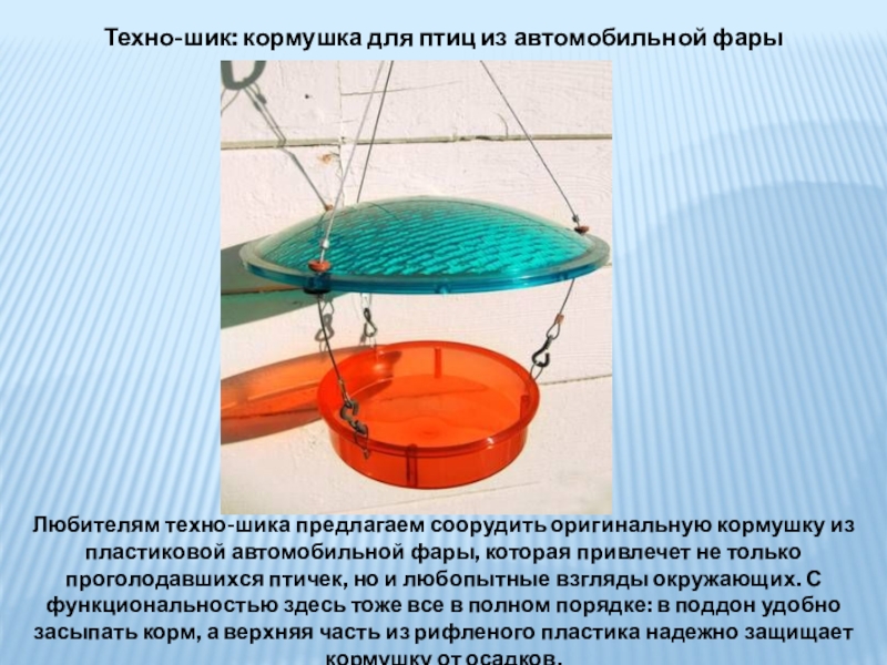 Слайд 28Техно-шик: кормушка для птиц из автомобильной фары