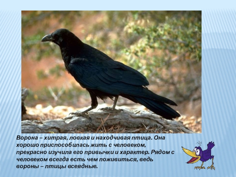 Слайд 11Ворона – хитрая, ловкая и находчивая птица. Она хорошо приспособилась жить