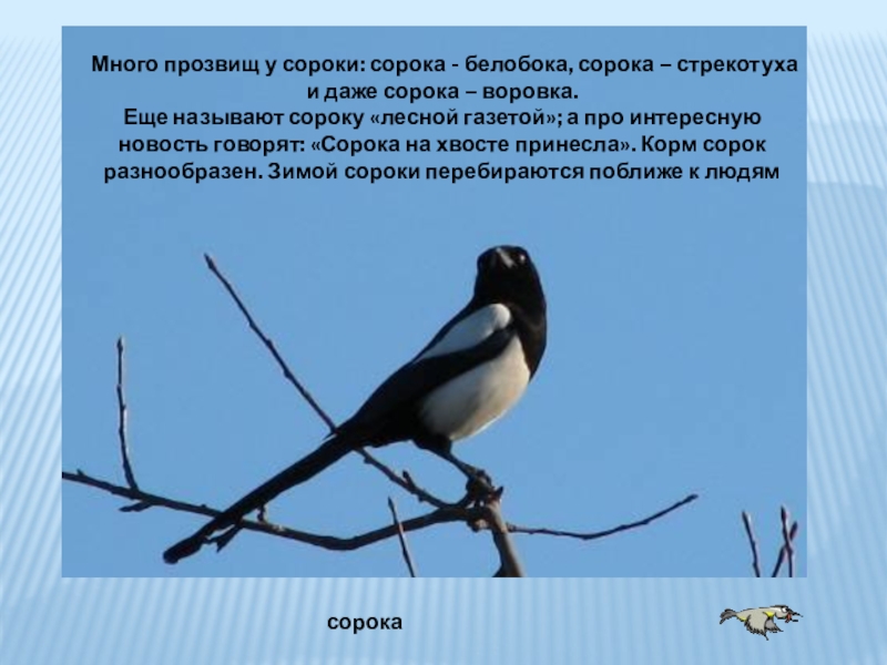 Еще называют сороку «лесной газетой»; а про интересную новость говорят: «Сорока на хвосте принесла». Корм сорок разнообразен. Зимой сороки перебираются поближе к людям
