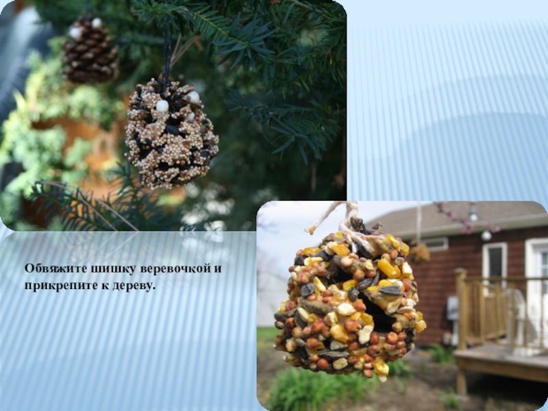 Слайд 34Обвяжите шишку веревочкой и прикрепите к дереву.