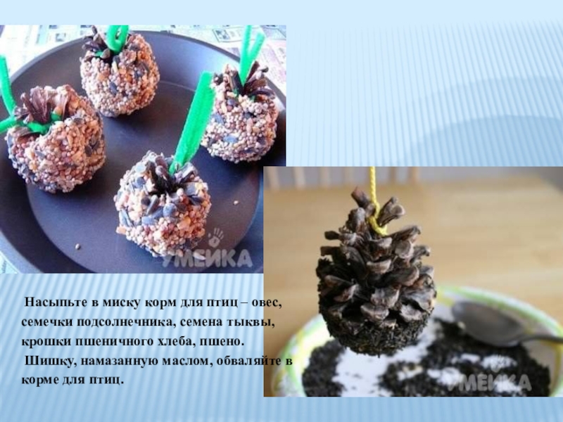 Слайд 33 Насыпьте в миску корм для птиц – овес, семечки подсолнечника, семена