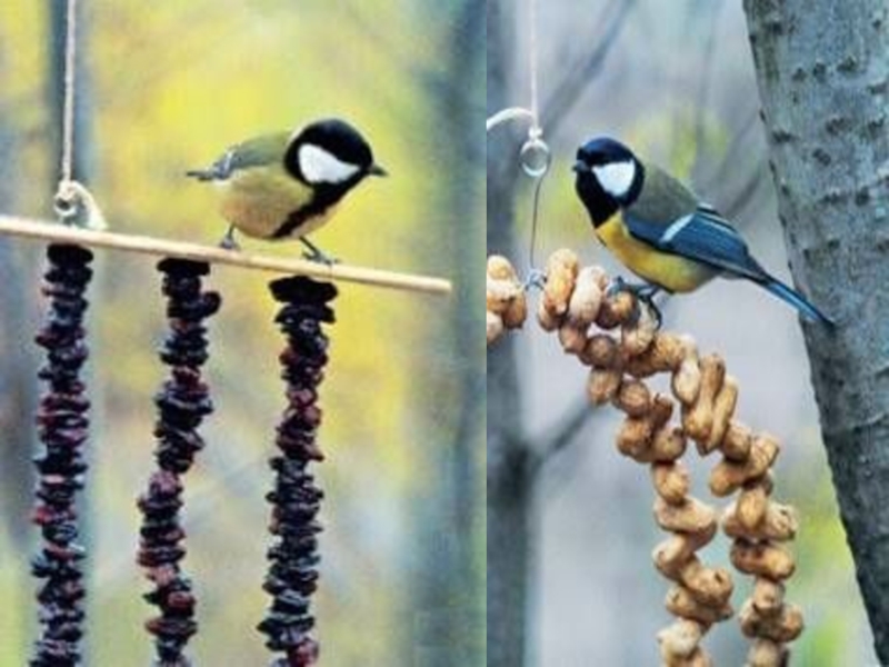 Изготовление кормушки: нанизываем на проволоку или бечевку корм. Можно каждую нить гирлянды закрепить на крючок или рейку.