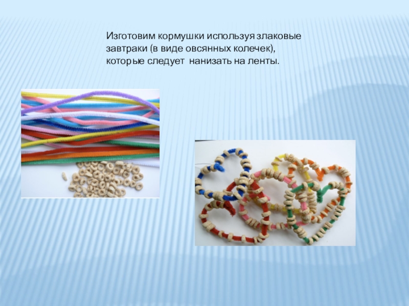 Слайд 40Изготовим кормушки используя злаковые завтраки (в виде овсянных колечек), которые следует