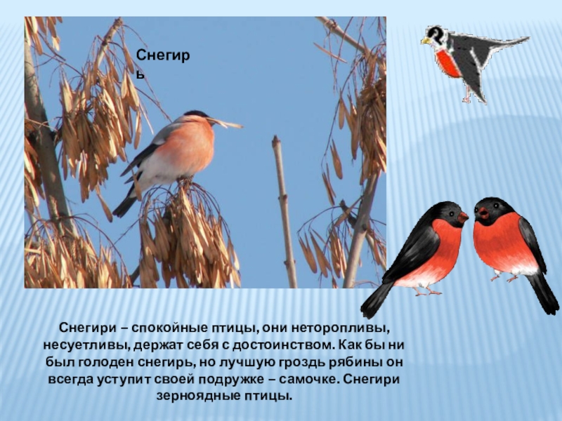 Как бы ни был голоден снегирь, но лучшую гроздь рябины он всегда уступит своей подружке – самочке. Снегири зерноядные птицы.