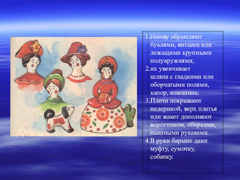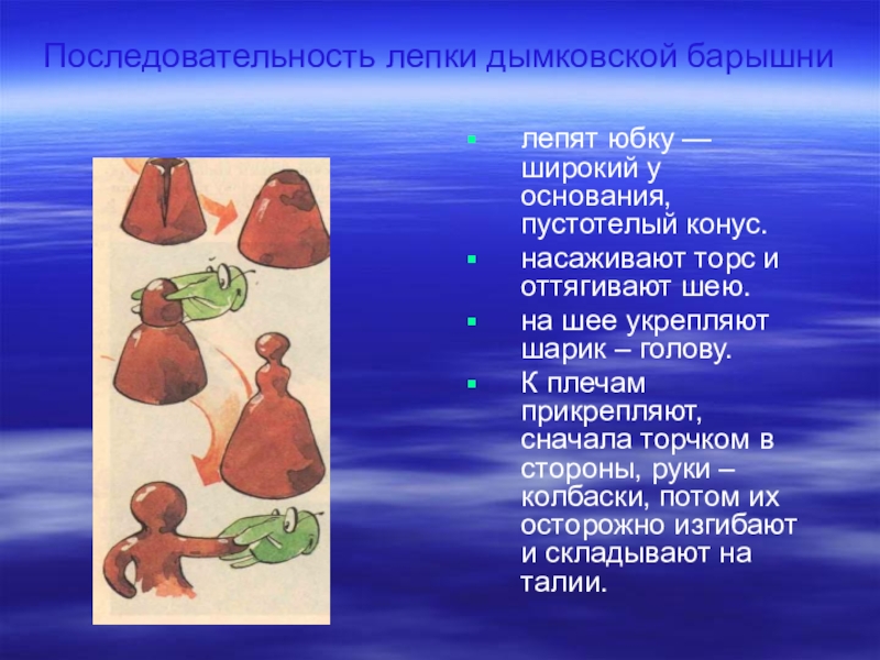 Последовательность лепки дымковской барышнилепят юбку — широкий у основания, пустотелый конус.насаживают торс и оттягивают шею.на шее укрепляют