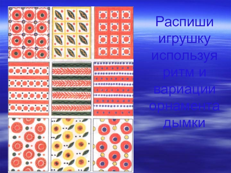 Слайд 14Распиши игрушку используя ритм и вариации орнамента дымки