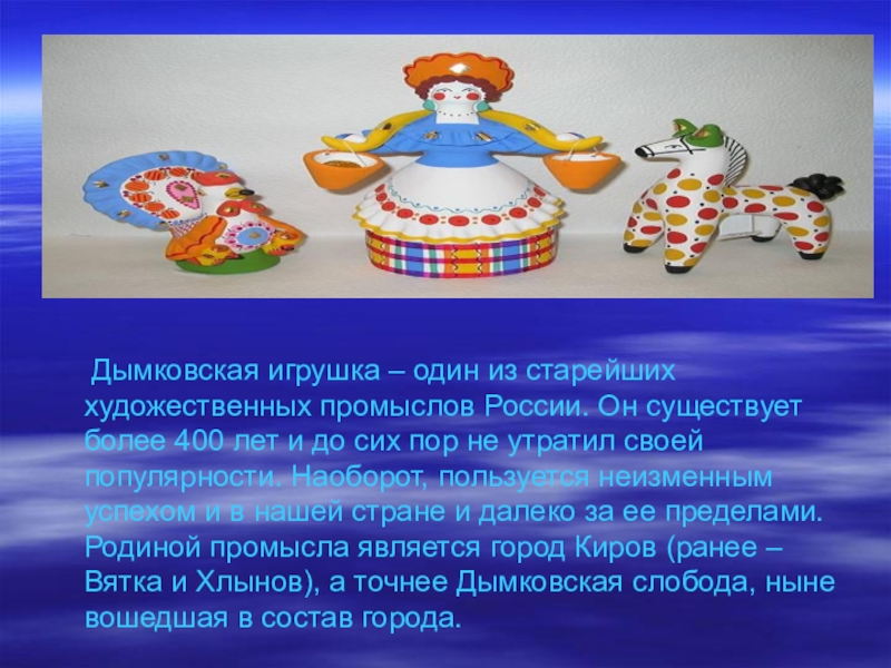 Дымковская игрушка – один из старейших художественных промыслов России. Он существует более 400 лет