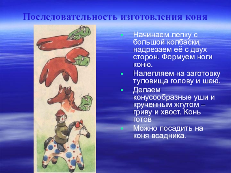 Последовательность изготовления коняНачинаем лепку с большой колбаски, надрезаем её с двух сторон. Формуем ноги коню.Налепляем на заготовку