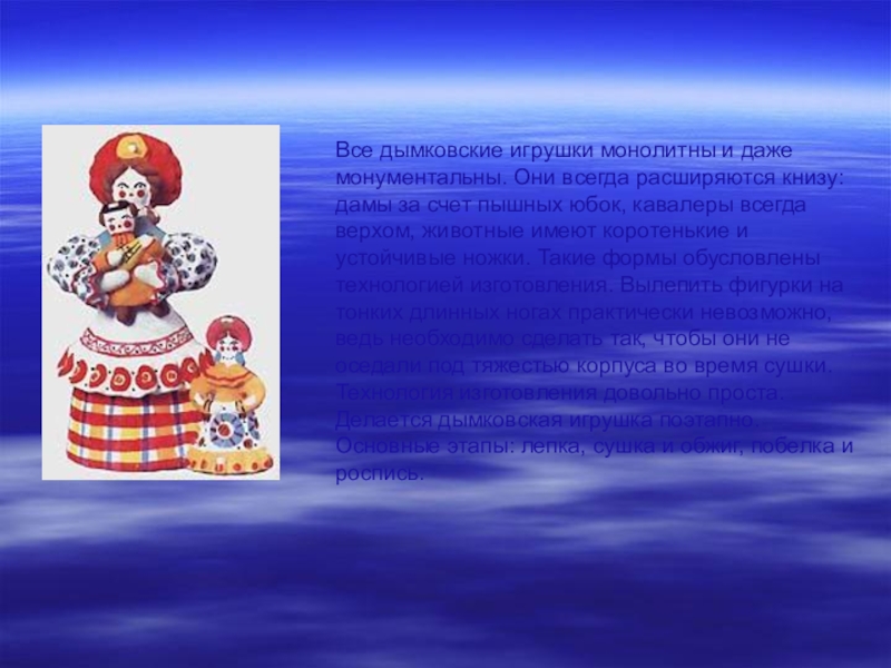 Слайд 3Все дымковские игрушки монолитны и даже монументальны. Они всегда расширяются книзу: