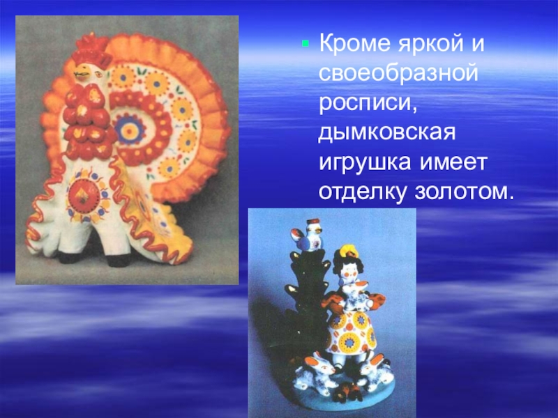 Слайд 16Кроме яркой и своеобразной росписи, дымковская игрушка имеет отделку золотом.