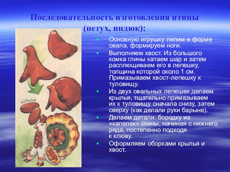 Последовательность изготовления птицы  (петух, индюк):Основную игрушку лепим в форме овала, формируем ноги.Выполняем хвост. Из большого комка