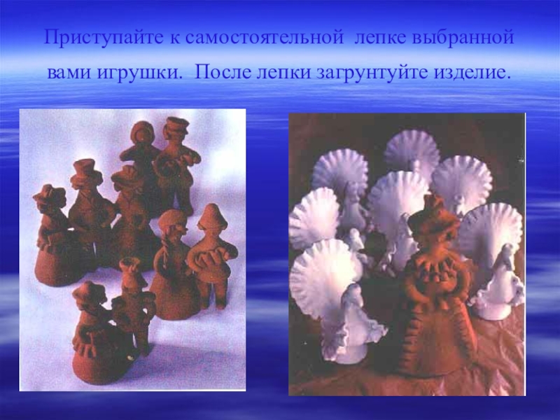Слайд 11Приступайте к самостоятельной лепке выбранной вами игрушки. После лепки загрунтуйте изделие.