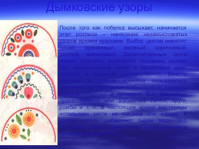 Дымковские узоры После того как побелка высыхает, начинается этап росписи – нанесение незамысловатых узоров яркими красками. Выбор
