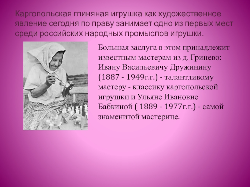 Большая заслуга в этом принадлежит известным мастерам из д. Гринево: Ивану Васильевичу Дружинину (1887 - 1949г.г.) - талантливому мастеру - классику каргопольской игрушки и Ульяне Ивановне Бабкиной ( 1889 - 1977г.г.) - самой знаменитой мастерице.