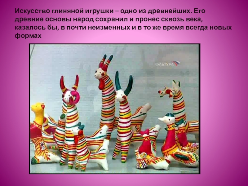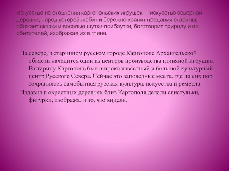 На севере, в старинном русском городе Каргополе Архангельской области находится один из центров производства глиняной игрушки. В старину Каргополь был широко известный и большой культурный центр Русского Севера. Сейчас это заповедные места, где до сих пор сохранилась самобытная русская культура, искусства и ремесла.