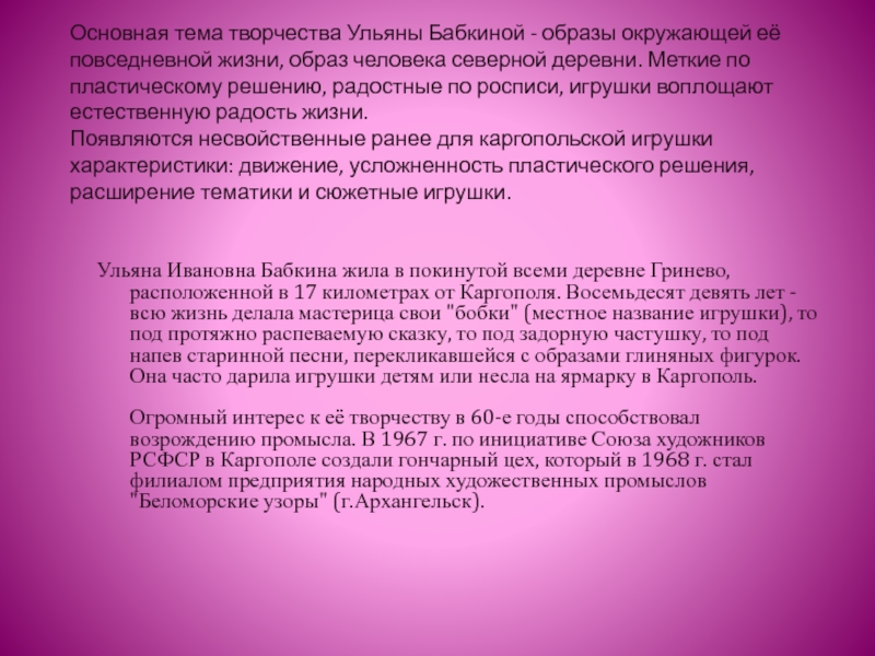 Ульяна Ивановна Бабкина жила в покинутой всеми деревне Гринево, расположенной в 17 километрах от Каргополя. Восемьдесят девять лет - всю жизнь делала мастерица свои "бобки" (местное название игрушки), то под протяжно распеваемую сказку, то под задорную частушку, то под напев старинной песни, перекликавшейся с образами глиняных фигурок. Она часто дарила игрушки детям или несла на ярмарку в Каргополь.
