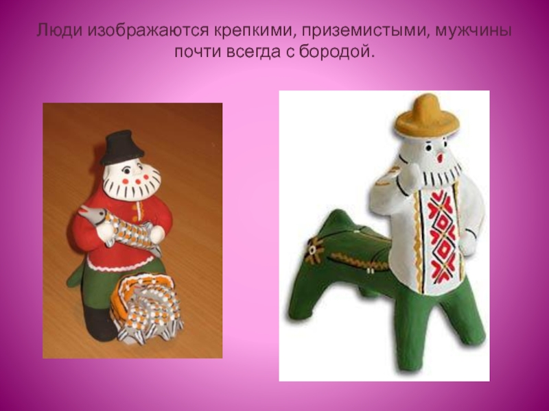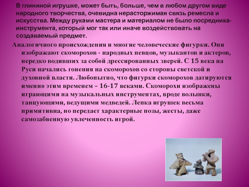 Аналогичного происхождения и многие человеческие фигурки. Они изображают скоморохов - народных певцов, музыкантов и актеров, нередко водивших за собой дрессированных зверей. С 15 века на Руси начались гонения на скоморохов со стороны светской и духовной власти. Любопытно, что фигурки скоморохов датируются именно этим временем – 16-17 веками. Скоморохи изображены играющими на музыкальных инструментах, вроде волынки, танцующими, ведущими медведей. Лепка игрушек весьма примитивна, но передает характерные позы, жесты, даже самозабвенную увлеченность игрой.