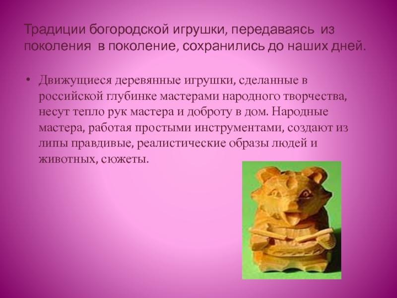 Движущиеся деревянные игрушки, сделанные в российской глубинке мастерами народного творчества, несут тепло рук мастера и доброту в дом. Народные мастера, работая простыми инструментами, создают из липы правдивые, реалистические образы людей и животных, сюжеты.