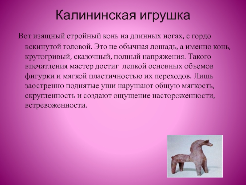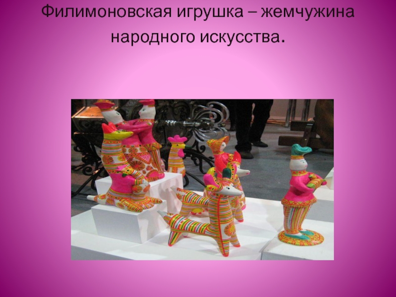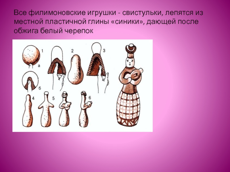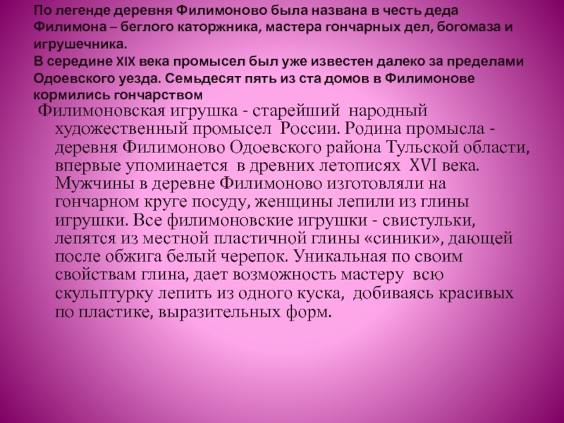 Филимоновская игрушка - старейший народный художественный промысел России. Родина промысла - деревня Филимоново Одоевского района Тульской области, впервые упоминается в древних летописях XVI века. Мужчины в деревне Филимоново изготовляли на гончарном круге посуду, женщины лепили из глины игрушки. Все филимоновские игрушки - свистульки, лепятся из местной пластичной глины «синики», дающей после обжига белый черепок. Уникальная по своим свойствам глина, дает возможность мастеру всю скульптурку лепить из одного куска, добиваясь красивых по пластике, выразительных форм.