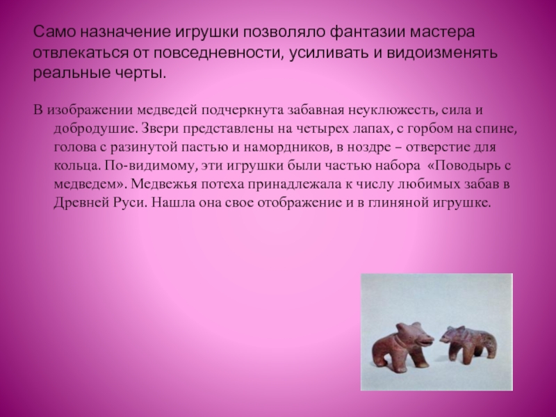 В изображении медведей подчеркнута забавная неуклюжесть, сила и добродушие. Звери представлены на четырех лапах, с горбом на спине, голова с разинутой пастью и намордников, в ноздре – отверстие для кольца. По-видимому, эти игрушки были частью набора «Поводырь с медведем». Медвежья потеха принадлежала к числу любимых забав в Древней Руси. Нашла она свое отображение и в глиняной игрушке.