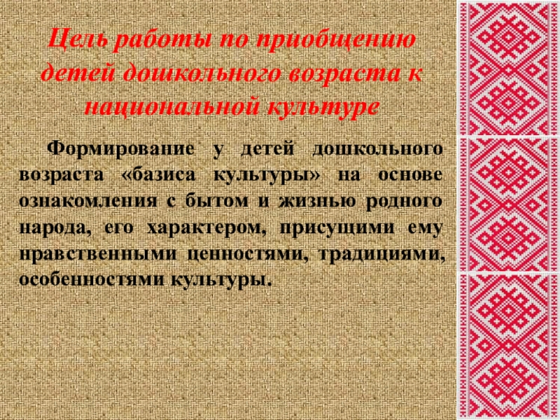 Цель работы по приобщению детей дошкольного возраста к национальной культуре