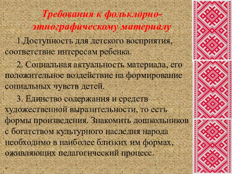 Формирование у детей дошкольного возраста «базиса культуры» на основе ознакомления с бытом и жизнью родного народа, его характером, присущими ему нравственными ценностями, традициями, особенностями культуры.