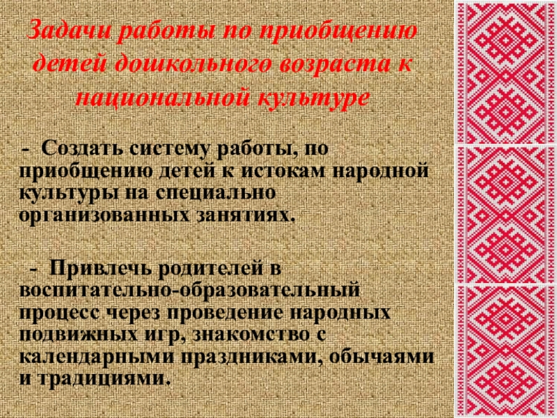 Задачи работы по приобщению детей дошкольного возраста к национальной культуре