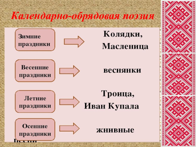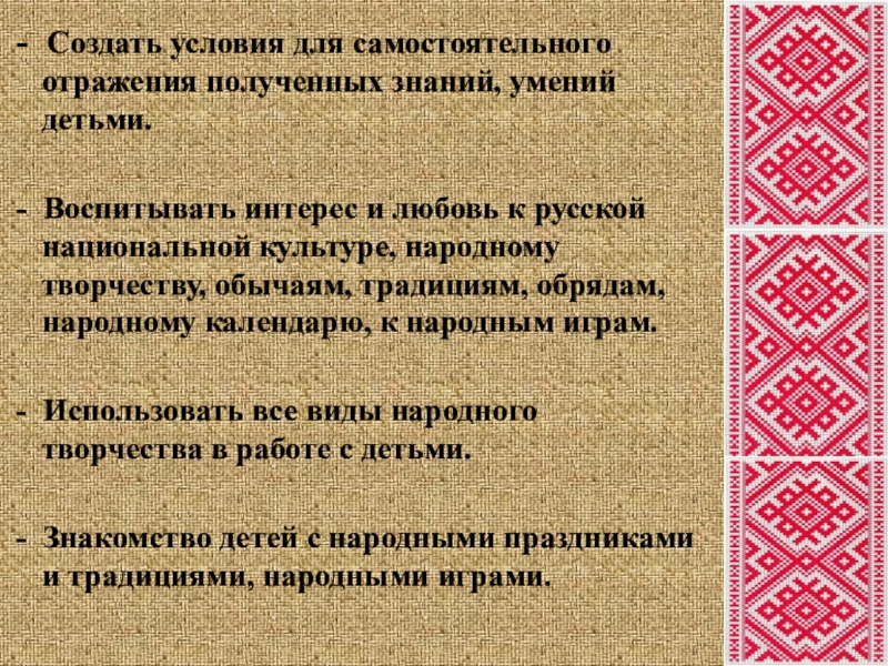 - Воспитывать интерес и любовь к русской национальной культуре, народному творчеству, обычаям, традициям, обрядам, народному календарю, к народным играм.