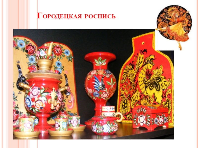 Городецкую роспись отличают бытовые сюжеты, такие как прогулка, празднество, и так далее. Преобладают яркие краски и зеленые, красные, синие цвета. Рядом с людьми — растения и животные, фигуры которых выполнены не в живописной, а в «детской» манере.