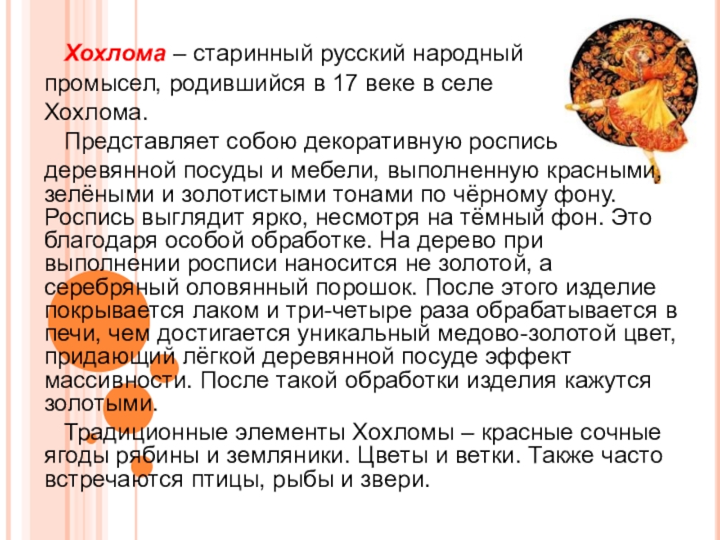 Традиционные элементы Хохломы – красные сочные ягоды рябины и земляники. Цветы и ветки. Также часто встречаются птицы, рыбы и звери.