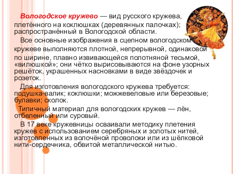 Слайд 25 Вологодское кружево — вид русского кружева,