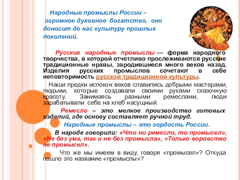 Русские народные промыслы — форма народного творчества, в которой отчетливо прослеживаются русские традиционные нравы, зародившиеся много веков назад. Изделия русских промыслов сочетают в себе неповторимость русской традиционной культуры.