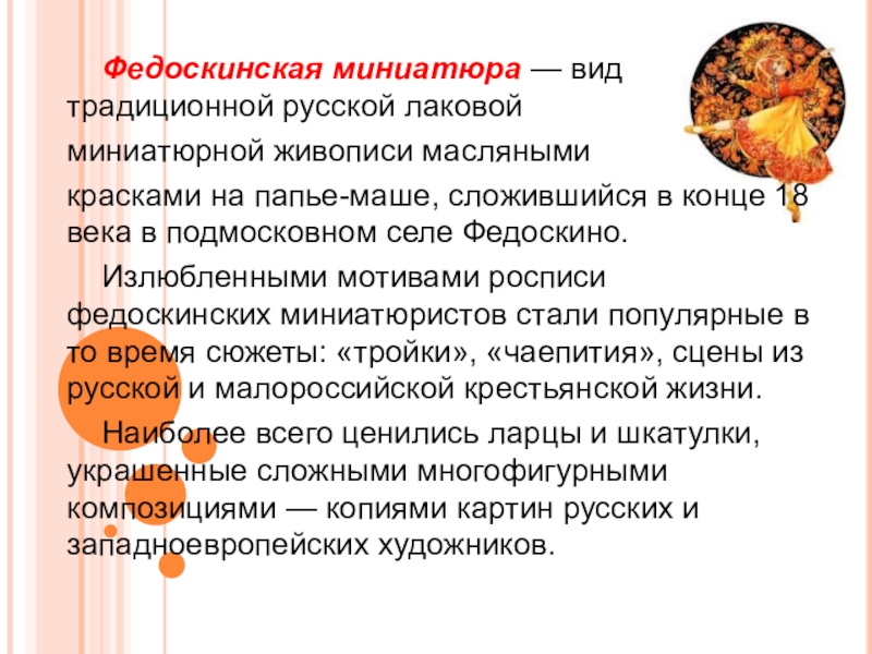 красками на папье-маше, сложившийся в конце 18 века в подмосковном селе Федоскино.