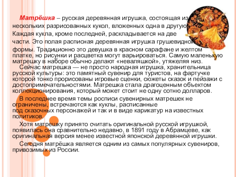 Сегодня матрёшка является одним из самых популярных сувениров, привозимых из России.