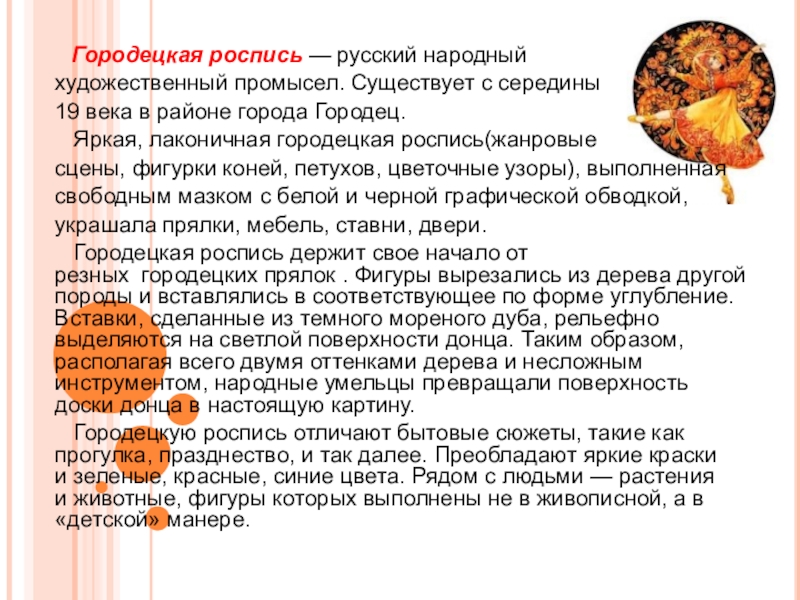 Городецкая роспись держит свое начало от резных городецких прялок . Фигуры вырезались из дерева другой породы и вставлялись в соответствующее по форме углубление. Вставки, сделанные из темного мореного дуба, рельефно выделяются на светлой поверхности донца. Таким образом, располагая всего двумя оттенками дерева и несложным инструментом, народные умельцы превращали поверхность доски донца в настоящую картину.