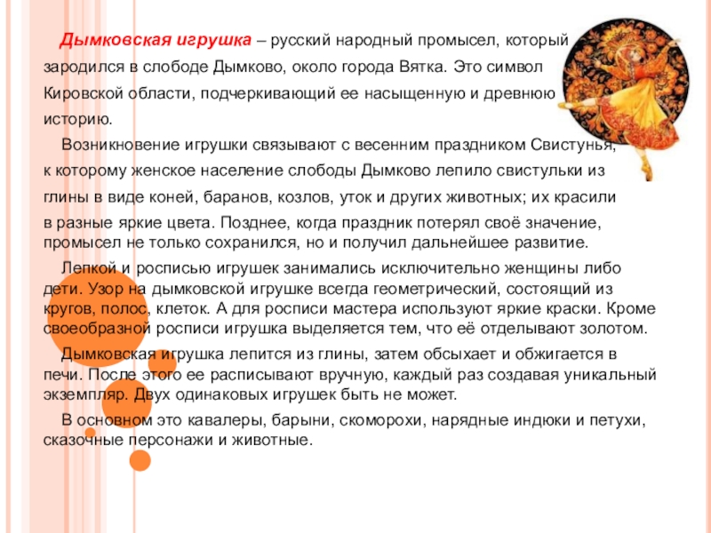 Слайд 19 Дымковская игрушка – русский народный промысел, который