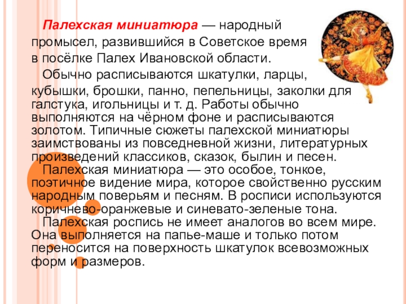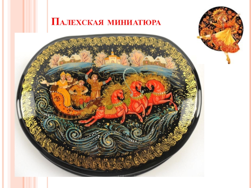 Палехская миниатюра — это особое, тонкое, поэтичное видение мира, которое свойственно русским народным поверьям и песням. В росписи используются коричнево-оранжевые и синевато-зеленые тона.