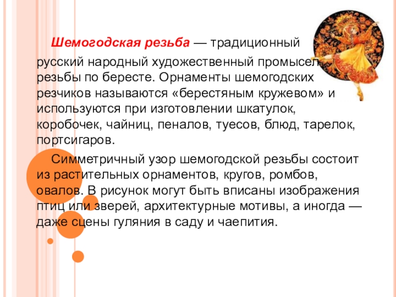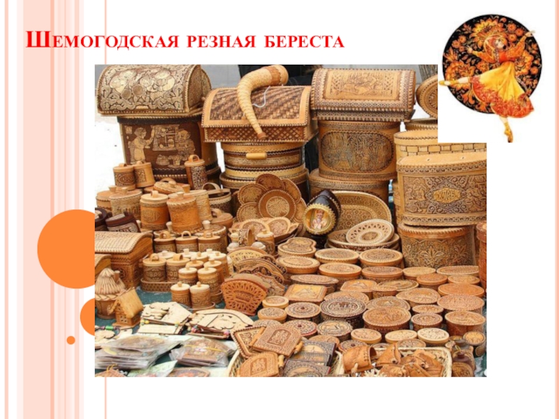 резьбы по бересте. Орнаменты шемогодских резчиков называются «берестяным кружевом» и используются при изготовлении шкатулок, коробочек, чайниц, пеналов, туесов, блюд, тарелок, портсигаров.